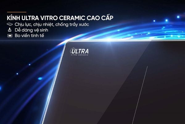 Điểm nhấn nổi bật của sản phẩm là mặt kính Ultra Vitro Ceramic chất lượng cao, với khả năng chịu nhiệt và lực tốt, mang lại độ bền vượt trội. Mặt kính sang trọng không chỉ giúp bếp thêm bóng bẩy mà còn chống trầy xước hiệu quả, giữ vẹn nguyên nét đẹp ban đầu sau thời gian dài sử dụng. Với bề mặt mịn, việc vệ sinh cũng trở nên dễ dàng, giúp người nội trợ tiết kiệm thời gian và công sức chỉ với vài động tác lau chùi nhẹ nhàng.