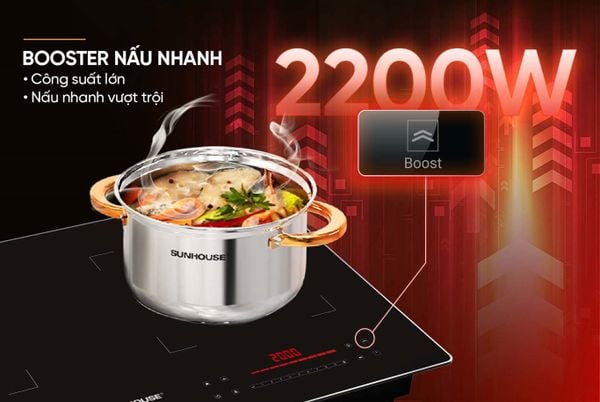 Bếp từ Sunhouse này còn có chức năng Booster vô cùng tiện lợi. Theo đó khi hoạt động chức năng này sẽ đẩy công suất mỗi vùng nấu lên tới 2.200W giúp rút ngắn thời gian nấu chín thức ăn.