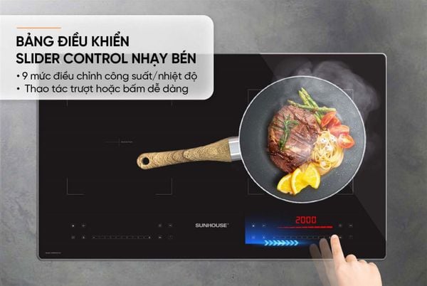 Bếp đôi điện từ Sunhouse SHB82032-EC còn sử dụng 2 bảng điều khiển riêng biệt cho từng vùng nấu. Bảng điều khiển này là sự kết hợp giữa cảm ứng với phím bấm giúp bạn thực hiện thao tác trượt tay sang trái hoặc phải để tăng/giảm và điều chỉnh nhiệt độ, công suất hoặc thời gian.