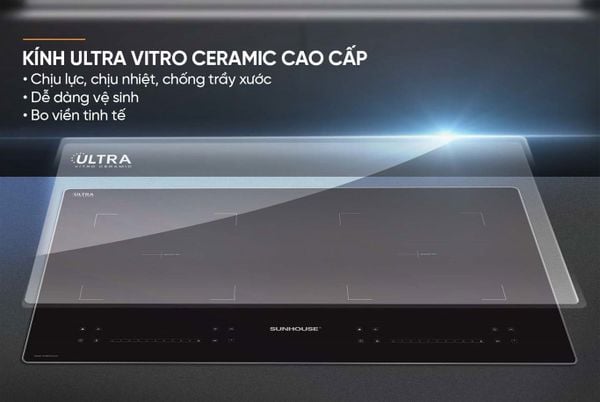Mặt bếp từ này được làm từ chất liệu kính Ultra Vitro Ceramic cao cấp cho khả năng chịu nhiệt lên tới 700 độ C sẽ đảm bảo độ bền vượt trội. Ngoài ra, chất liệu kính này còn hạn chế tình trạng trầy xước đồng thời giúp việc vệ sinh, lau chùi thuận tiện nhất để sản phẩm luôn sáng đẹp như mới.