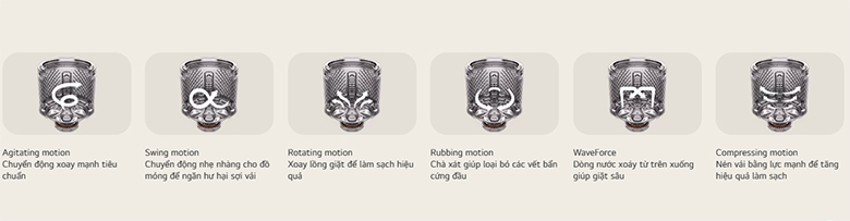Máy giặt LG mô phỏng 6 chuyển động giặt khác nhau như giặt đập, giặt quay, giặt nén, giặt nhào trộn,… giúp quần áo được làm sạch tối ưu mà vẫn giữ được độ bền của sợi vải. Công nghệ này đặc biệt hữu ích cho những loại vải mỏng, đồ trẻ em hay trang phục cao cấp.