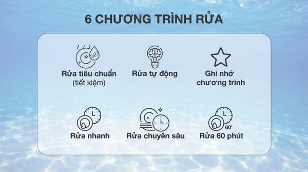Máy rửa bát độc lập SMS2IVW01P được trang bị 6 chương trình rửa: Rửa chuyên sâu 70°C, Rửa tự động , Rửa tiết kiệm năng lượng , Rửa nhanh 45 , Rửa nhanh 60 phút, Tráng. Bên cạnh đó, máy còn tích hợp 4 chương trình hỗ trợ: Remote Start, Tăng tốc độ rửa, Rửa nữa tải, Rửa diệt khuẩn.