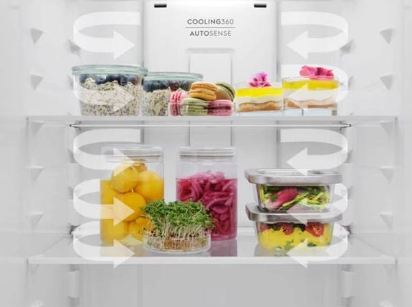 Tủ lạnh Electrolux ;Inverter 341 lít ETB3460L-B sở hữu công nghệ Cooling 360° đảm bảo hơi lạnh được phân phối đồng đều đến mọi ngóc ngách trong tủ nhờ hệ thống thoát hơi từ thành sau. Không gian tủ duy trì nhiệt độ và độ ẩm ổn định, không có vùng chênh lệch nhiệt, giúp thực phẩm được làm lạnh toàn diện, giữ tươi lâu hơn. Từ rau củ ở ngăn dưới đến thực phẩm ở ngăn trên, tất cả đều được bảo quản trong điều kiện lý tưởng, bảo toàn hương vị, kết cấu và dưỡng chất. Công nghệ này không chỉ kéo dài thời gian lưu trữ mà còn giảm nguy cơ hư hỏng thực phẩm, mang lại sự yên tâm cho người dùng.